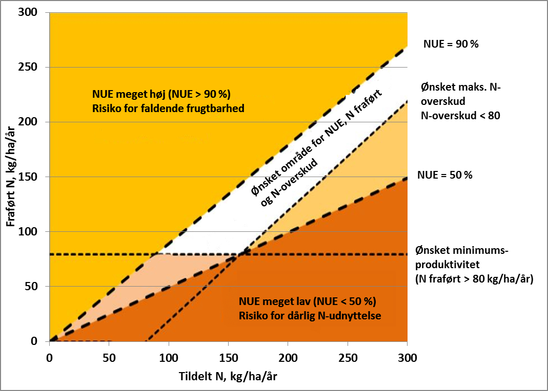 Hvid farve: Det er i det område, som ekspertgruppen mener, at man skal ligge i for at kvælstofeffektiviteten er tilfredsstillende. Dvs. hvor NUE er mellem 50 og 90 pct., hvor kvælstofoverskuddet samtidig er under 80 kg N pr. ha og hvor output af kvælstof er over 80 kg N pr. ha.