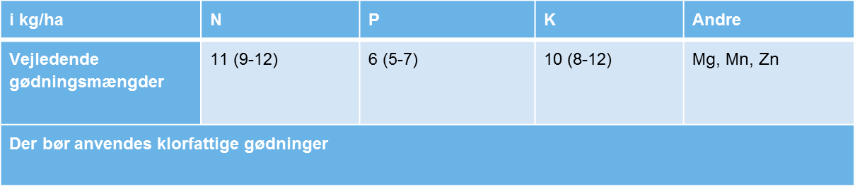 Det kan være aktuelt at dele gødningstilførslen for at undgå spireskader. Delgødskning i sæsonen kan med fordel foregå i forbindelse med tidlig radrensning. Bønner er udsatte for magnesiummangel og skal have ekstra tilførsel hvis magnesiumtallet Mgt er under 6-7. Der kan opstå mangel på mangan og zink ved højt reaktionstal. Bønner er udsatte for borforgiftning og bør ikke dyrkes på jorde, hvor der året før har været tilført større mængder bor.
