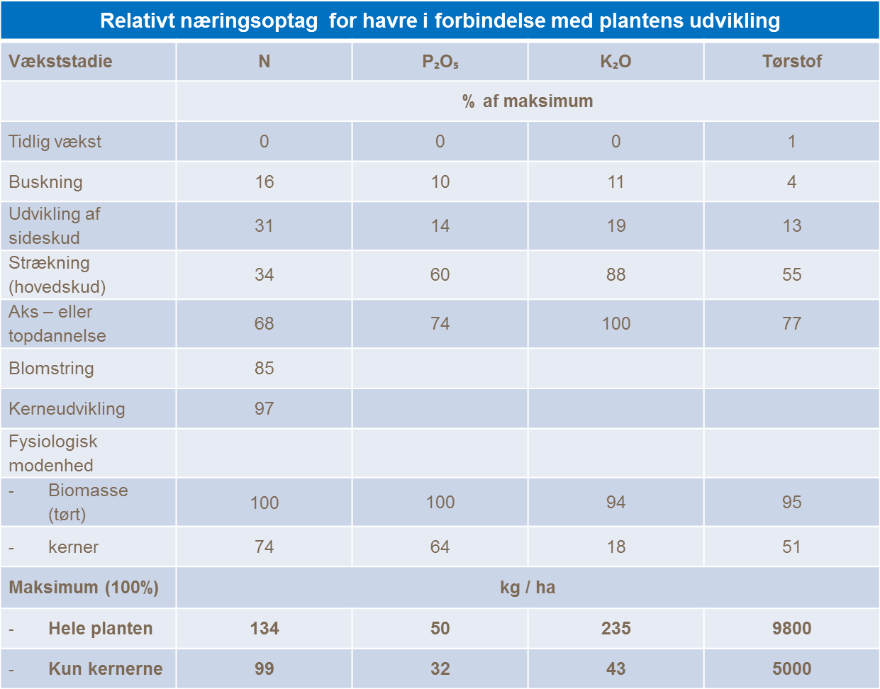 Med det omfattende rodnet som havren har, er den mere effektiv til at optage næringsstoffer fra jorden end andre kornsorter. Havren optager dog ikke ikke større mængder næring end andre kornsorter som f.eks hvede eller byg. Kvælstofanvendelse har en væsentlig påvirkning på havrens indhold af kvælstof, som ligger på mellem 1,9% og 2,6%. Derfor indeholder tørstoffet 19-26 kg/N pr. ton tørstof. Mængden af andre næringsstoffer varierer fra få kilo til få gram pr. ton tørstof.