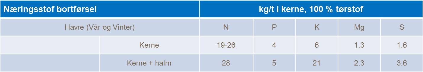 Kvælstof og kalium er de to næringsstoffer der kræves størst mængder af for at kunne fastholde høje havreudbytter. Modsat, er fosfat behovet identisk med behovet for svovl. Behovet for de forskellige makronæringsstoffer forekommer under den hurtige forårsvækst.