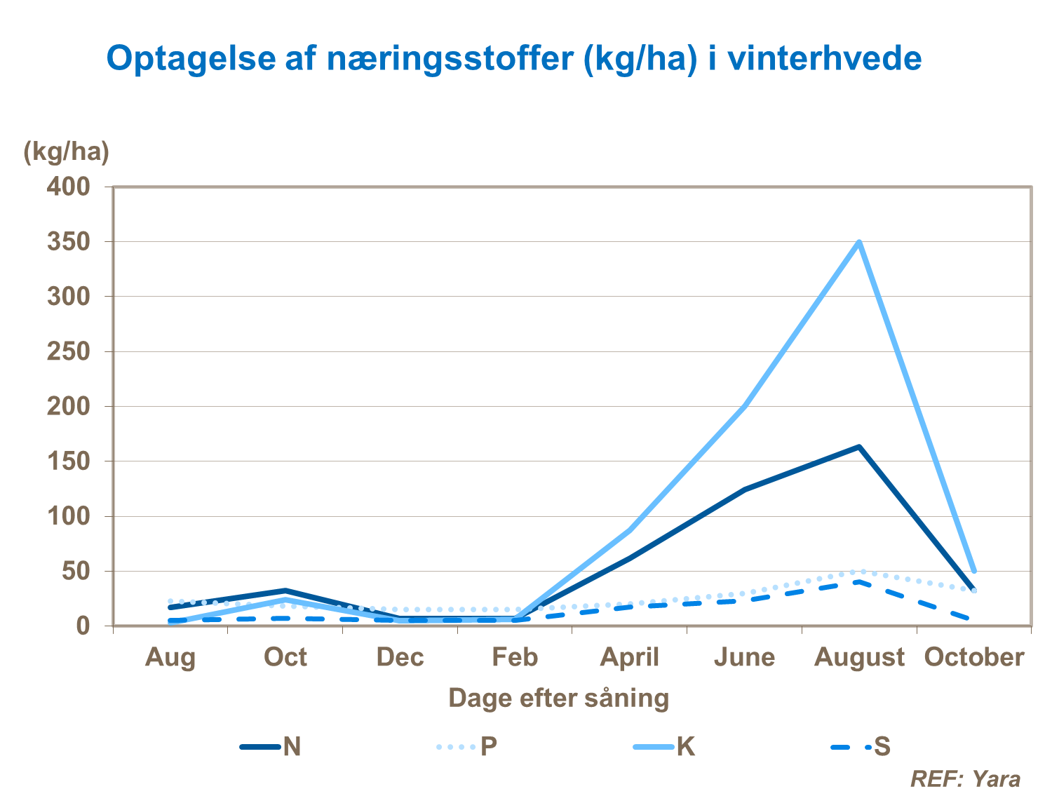 Når planten begynder at vokse i foråret (6-7 måneder efter såning) vil det daglige behov for næringsstoffer stige når biomassen udvikler sig. Behovet for kvælstof, fosfor og svovl vil i denne periode være højt og det er derfor vigtigt med flere forskellige næringsstoffer for at kunne stille behovet. Den hurtige vækst og udvikling vil også medføre et stort behov for mikronæringsstoffer. Kortvarige mangler kan opstå hvilket kan modhjælpes med bladgødskning med mikronæringsstoffer (YaraVita produkterne). Mangan, zink, kobber og magnesium bør i denne vækstperiode alle være tilgængelige i den korrekte mængde.