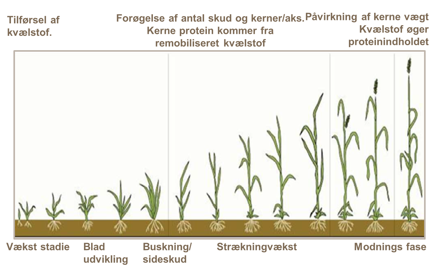 Kvælstof er en fundemental del af aminosyrer, som er byggeklodserne for kornets proteiner. Derfor er det vigtigt at kontrollere denne del når det gælder dyrkning af hvede med højt indhold af proteiner. Kornets proteinindhold er en nyttig indikator for om kornet modtager den ideelle kvælstof mængde. Da den optimale kvælstof tilførsel ændrer sig (grundet økonomi), eller tilførtkvælstof varierer fra det optimale, ændrer proteinindholdet sig typisk med omkring 1% for hver 50kg N/ha.