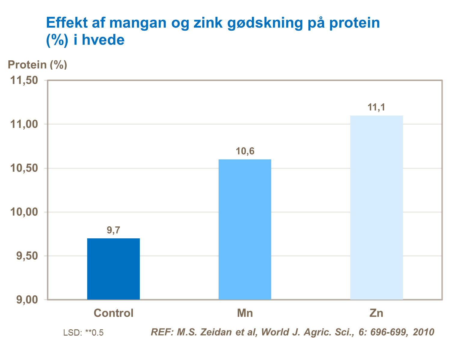 Lave protein tal, altså under 10%, indikerer en mindre optimal kvælstof brug. Timingen i brugen af kvælstof er vigtig. Tidlig kvælstof tildeling vil mest blive brugt af planten til at skabe højt udbytte, mens der for at skabe et højere proteinindhold vil skulle tilføres kvælstof mellem vækststadierne 37 og 59. Hvor niveauet for kvælstof i bladene ikke er opretholdt kan forebyggende tilførsel med kvælstof udføres med bladgødningsprodukter omkring blomstring.