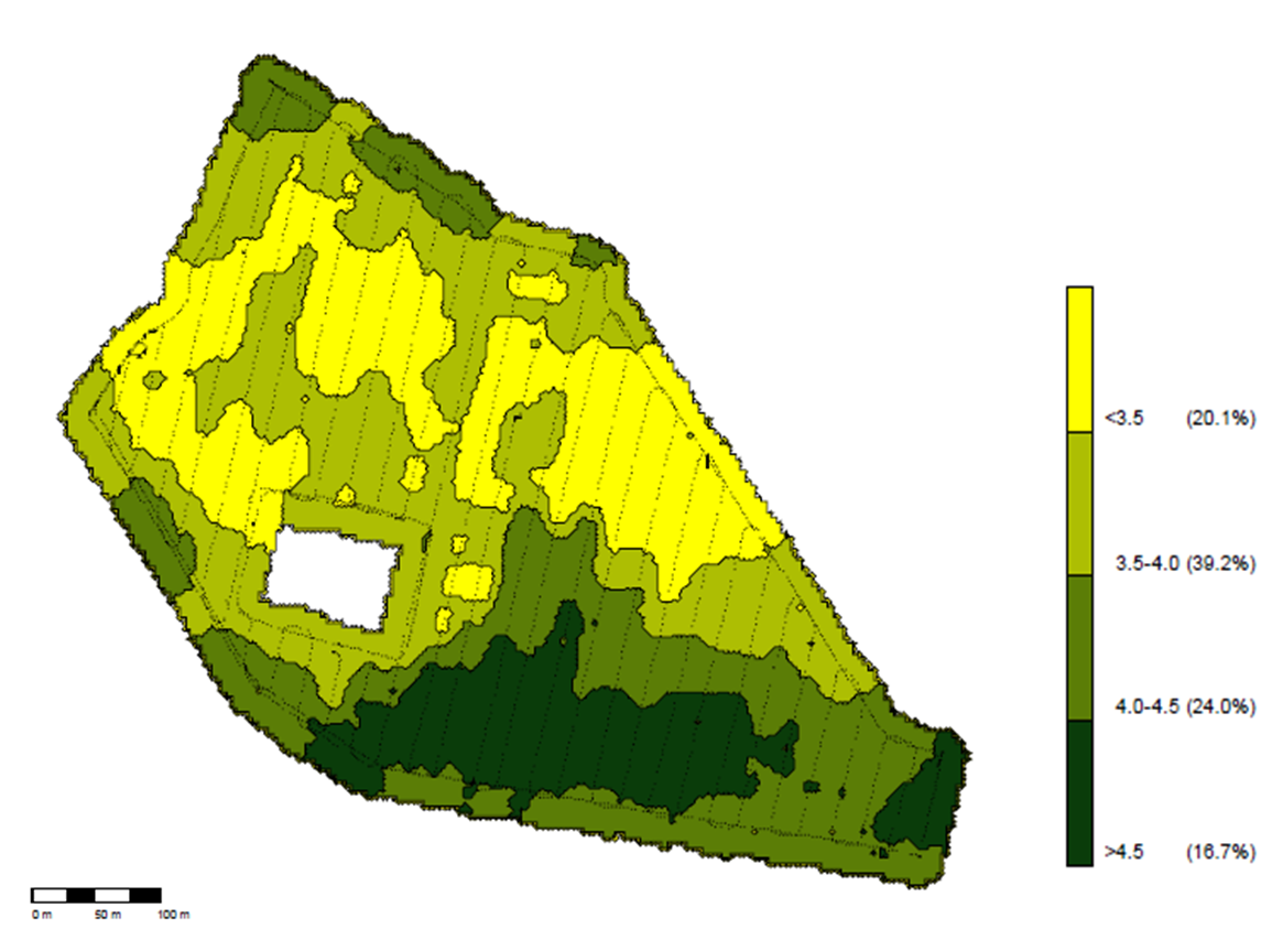 Variationen i denne mark følger i dette tilfælde jordtype og Rt. Den nordlige del af marken har et meget højt lerindhold og lavt Rt. Afgrøden har derfor dårlig adgang til kvælstof og man ser ofte, at de lavtliggende områder er mørkere i farven, fordi der har er en forskydning af organisk kvælstof til disse områder. Som det kan ses i det sydlige område af marken.