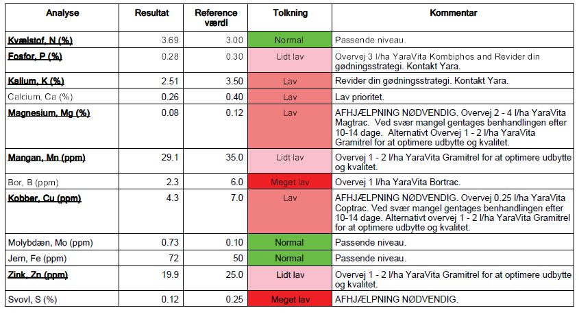 Fra resultaterne af analysen kan man se at manganindholdet som forventet er meget lavt, men det kan også ses at kobber, zink og til dels magnesium er for lavt. Borindholdet er også lavt, men bor har mindre betydning for udbyttet i kornafgrøder.