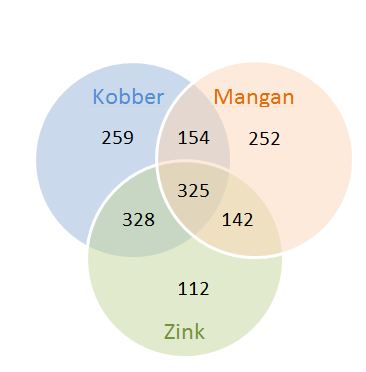 I figuren ses at i hovedparten af analyserne er der mere end et næringsstof, der er i mangel. Man kan også se at kobber er det næringsstof der oftest er mangel på, herefter zink og på tredjepladsen kommer mangan. At mangan ”kun” er nummer tre skyldes nok at der anvendes mangan på de fleste arealer.