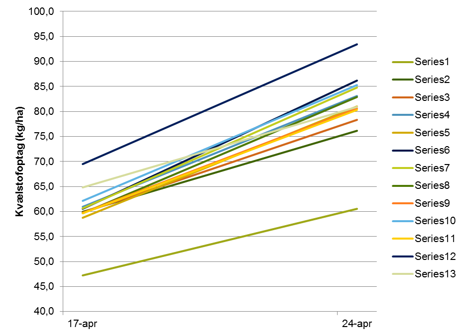 Kvælstofoptaget fortsætter trods det tørre vejr og er på de målte lokaliteter øget med 25 – 50% i de gødede parceller siden sidste måling i stadie 31. Der er tendens til at parceller, hvor der er tildelt mindre end 100 kg total kvælstof, nu på flere lokaliteter er begrænset af manglende kvælstof (serie 2-3 + 13). Det er til gengæld tydeligt at en kvælstofstrategi hvor hveden i marts blev startet op med 100 kg N fortsat er lykkes med et meget stort kvælstofoptag (serie 12). Der har på nuværende tidspunkt været en god udnyttelse af kvælstof tildelt tidligt. Parceller som i stadie 31-32 er gødet op til 150 kg N eller mere, har endnu ikke optaget det tildelte kvælstof og mangler endnu ikke kvælstof (serie 5-11).