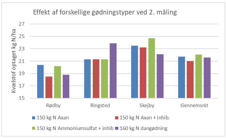 På nuværende tidspunkt har de to led med fast gødning modtaget 150 kg N/ha, og DanGødning leddet har modtaget 160 kg N/ha. De faste gødninger er tilsat nitrifikationsinhibitor og bliver holdt op mod YaraBela AXAN uden inhibitor. Nedenfor ses målingerne af kvælstofoptaget ved 2., 3. og 4. måling. Ved 2. måling var der ikke nogen forskel i optag, men siden da har leddet med ammonuimsulfat tilsat inhibitor ikke kunnet følge de øvrige i optag, og det er nu 5-6 kg N/ha bagud. Inhibitoren har ikke samme effekt på YaraBela AXAN, da denne gødning indeholder 50 % nitratkvælstof, der ikke inhiberes, mens al kvælstof i ammoniumsulfat er påvirket af inhibitor. Optaget fra de tre målinger ses i figurerne nedenfor.