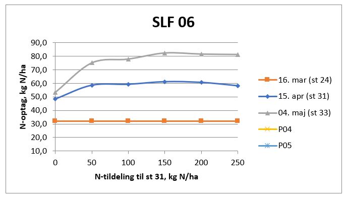 Tredje måling af kvælstofoptaget er foretaget (P03- 24. april). Hveden er i stadie 32. Som det ses af figuren er kvælstofoptaget på denne lokalitet ikke begyndt. Første gødskning er udført 25. marts og anden gødskning er udført 15. april.