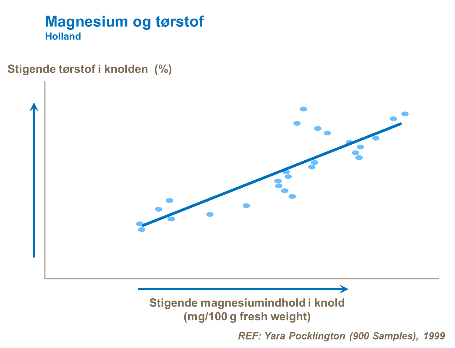 Lav tilgængelighed af magnesium kan føre til et reduceret stivelsesindhold i knoldene og forsøg har bevist de positive effekter som magnesium har på tørstofindholdet og vægtfylde.