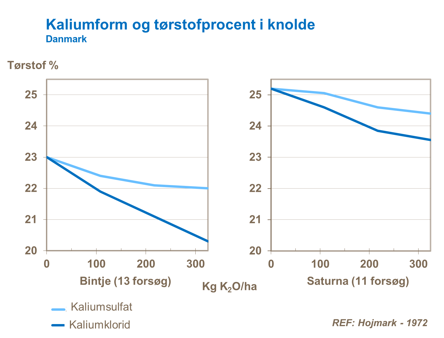 Anvendelsesformen af kalium har en effekt på tørstofindholdet. Sulfat eller kaliumsulfat kan resultere i højere tørstofindhold end kaliumklorid og er derfor ofte den foretrukne for i kartofler.