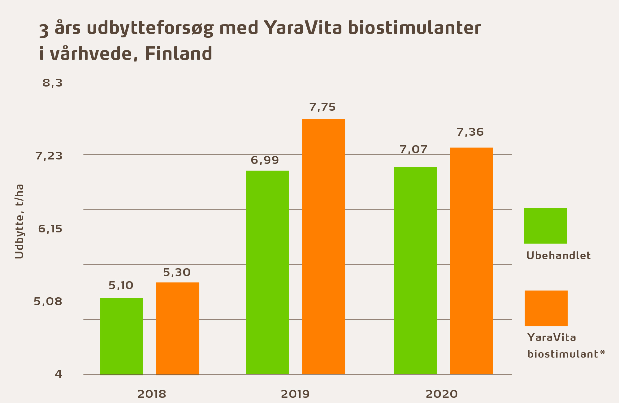 FIGUR 3 - Udbytteforsøg med YaraVita biostimulanter i vårhvede, Kotkaniemi, Finland, 3 års forsøg viser stabile merudbytter. Biostimulant er tildelt i st. 22 og 32. 1 forsøg med 4 gentagelser hvert år.