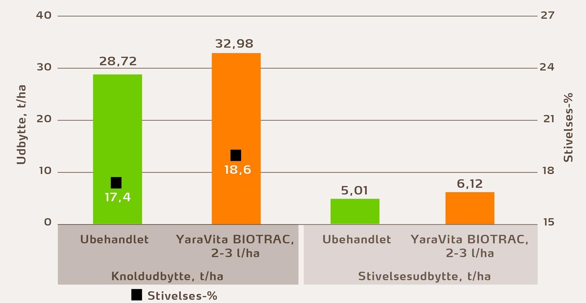 FIGUR 4 - Demonstrationsforsøg med YaraVita OPTITRAC i stivelseskartofler, Karijoki, Finland. Både udbytte og stivelsesprocent forbedres markant. OPTITRAC er tildelt hhv. 28. juni og 11. juli. JB 2.