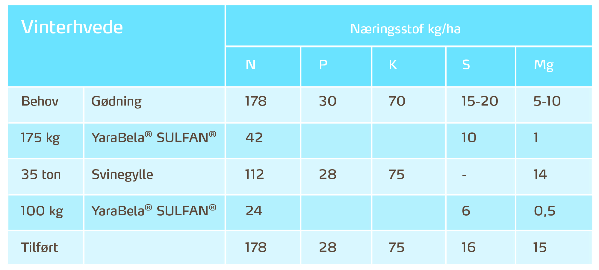 TABEL 2 - Gylletildeling er beregnet med 140 kg total N med indhold på 4 kg total N/ton og 80 % udnyttelse. Gylle indeholder svovl og magnesium, men det mineraliseres langsomt og kun en lille del er tilgængeligt i vækstsæsonen. Den sidste kvælstoftildeling med YaraBela SULFAN udføres ved begyndende skridning i stadie 37 og kan med fordel gradueres med Atfarm eller N-sensor.