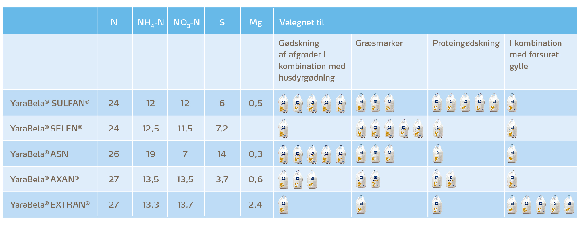 TABEL 1 – Egenskaber ved YaraBela® gødninger. 1 sæk = mindre egnet. 5 sække = optimal løsning.