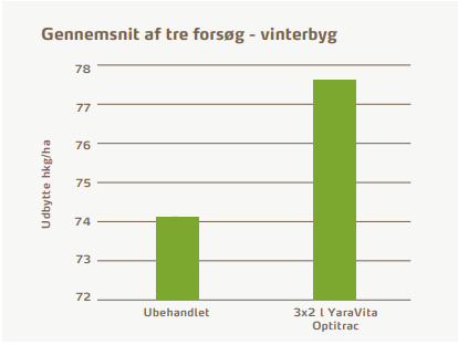 YaraVita Optitracs forbyggende effekt blev efterprøvet i tre landsforsøg i vinterbyg, hvor en behandling med 3x2 l YaraVita Optitrac pr. ha resulterede i et gennemsnitligt merudbytte på 3,4 hkg/ha. Resultaterne ses i figur 1.