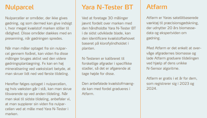 ”Kombinationen af N-Tester, Atfarm og egne erfaringer med mine marker er tre gode faktorer til at fastsætte kvælstofniveauet i sidste til. Den totale mængde kvælstof, der skal tildeles pr. ha, fastlægges med hjælp fra N-Testeren og nulparcellen. Atfarm angiver derefter fordelingen af denne mængde kvælstof hen over marken. På Birkeballegaard er graduering afgørende for udbyttet, da terrænet er megetdeling mark for mark samt at fordele og variere den fastsatte mængde kvælstof optimalt indenfor den enkelte mark”, konkluderer Svend Åge Lassen.