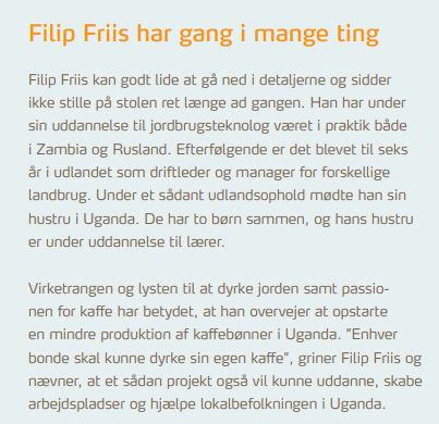 Filip Friis driver, sammen med sin hustru og syv ansatte, Holmsgaard, som er en økologisk bedrift beliggende i Sønderjylland. Siden han overtog gården i 2019 har han udvide og justeret bedriften bl.a. er malkekobesætningen fornyet med jerseyracen, og der eksperimenteres med nye afgrøder samt formaling og toasting af disse, så selvforsyningen af mineraler til de nu 300 jerseykøer kan øges.
