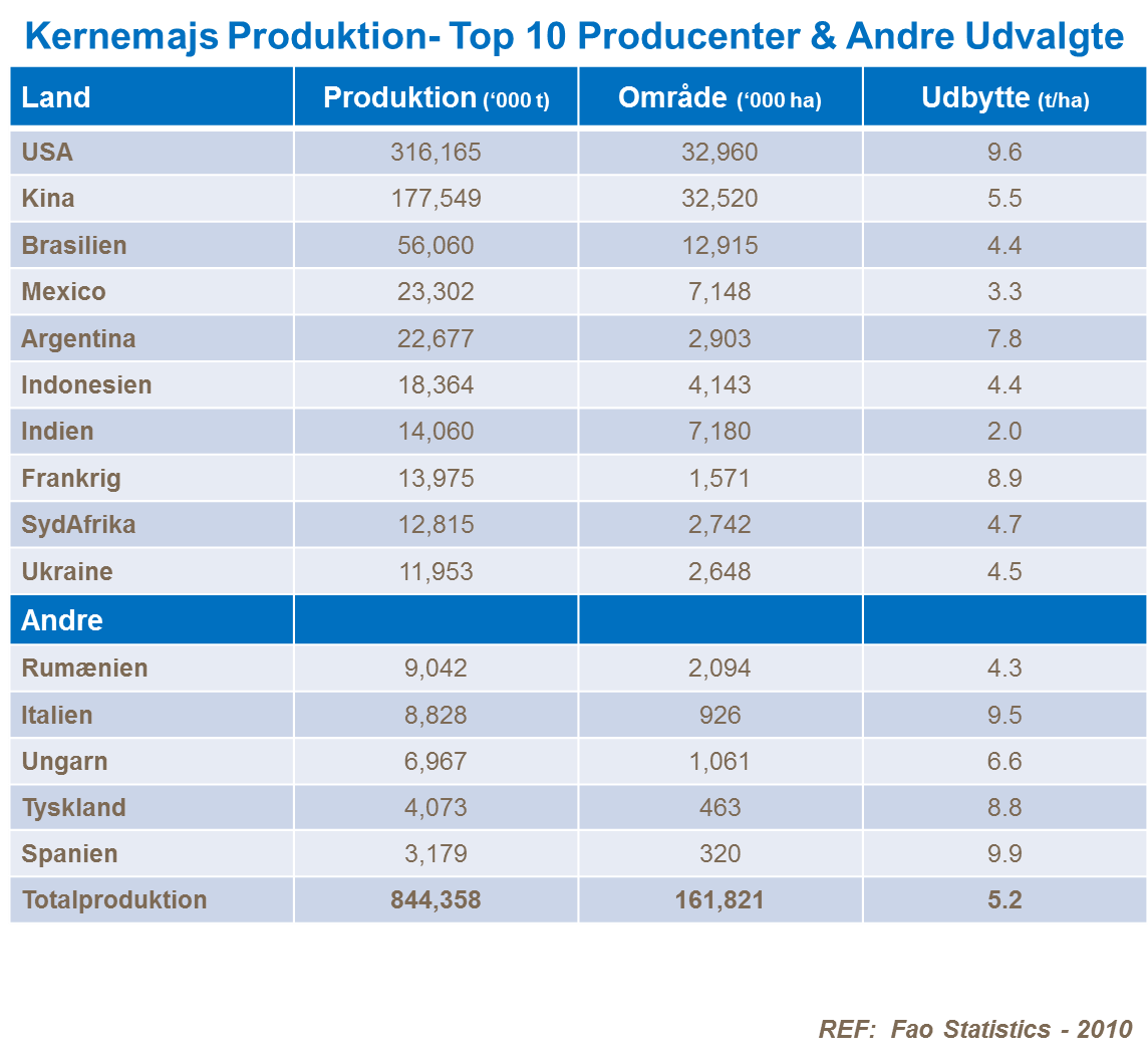 Omkring 40% af USA’s majsproduktion - 130 million ton - bruges til bioethanol. Et ton majs giver omkring 4-500 liter bioethanol.