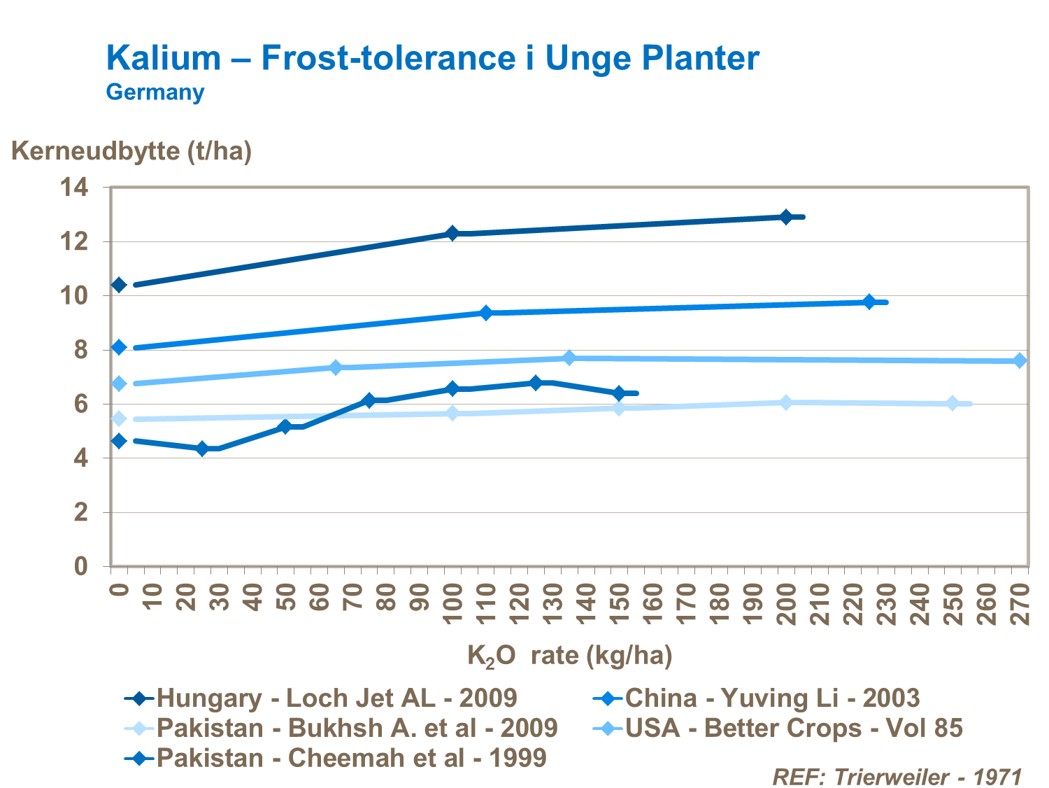 Anvendelse på op til 65 kg P/ha giver positiv udbytterespons i forsøg på jorde med lave fosfortal. Selv på jorde med høje fosfortal er anvendelse af 8-10 kg P/ha nødvendig i startgødning.