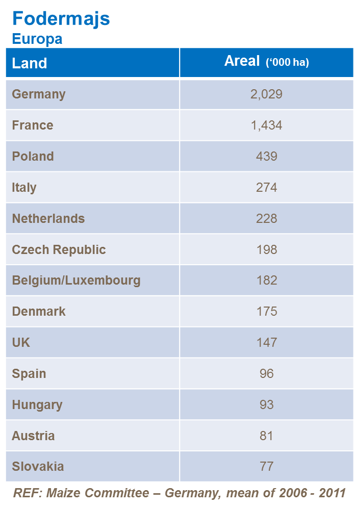 I Europa produceres der årligt silomajs på ca. 5 millioner hektar og kernemajs på et tilsvarende areal. Tyskland og Frankrig er førende i produktionen.