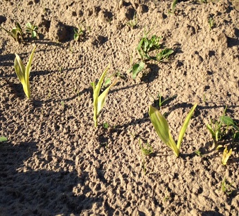 Majsen havde på daværende tidspunkt mange steder kun 2-3 blade (afhængigt af såtidspunkt) og rødder på ca. 1,5 – 2 centimeter som endnu ikke nået den placerede startgødning. Det er normalt omkring stadie 5-6 blade at næringsstofoptagelse af fosfor begynder at tage fart (se figur), og majs plejer medio juni måned at have 6-8 blade.