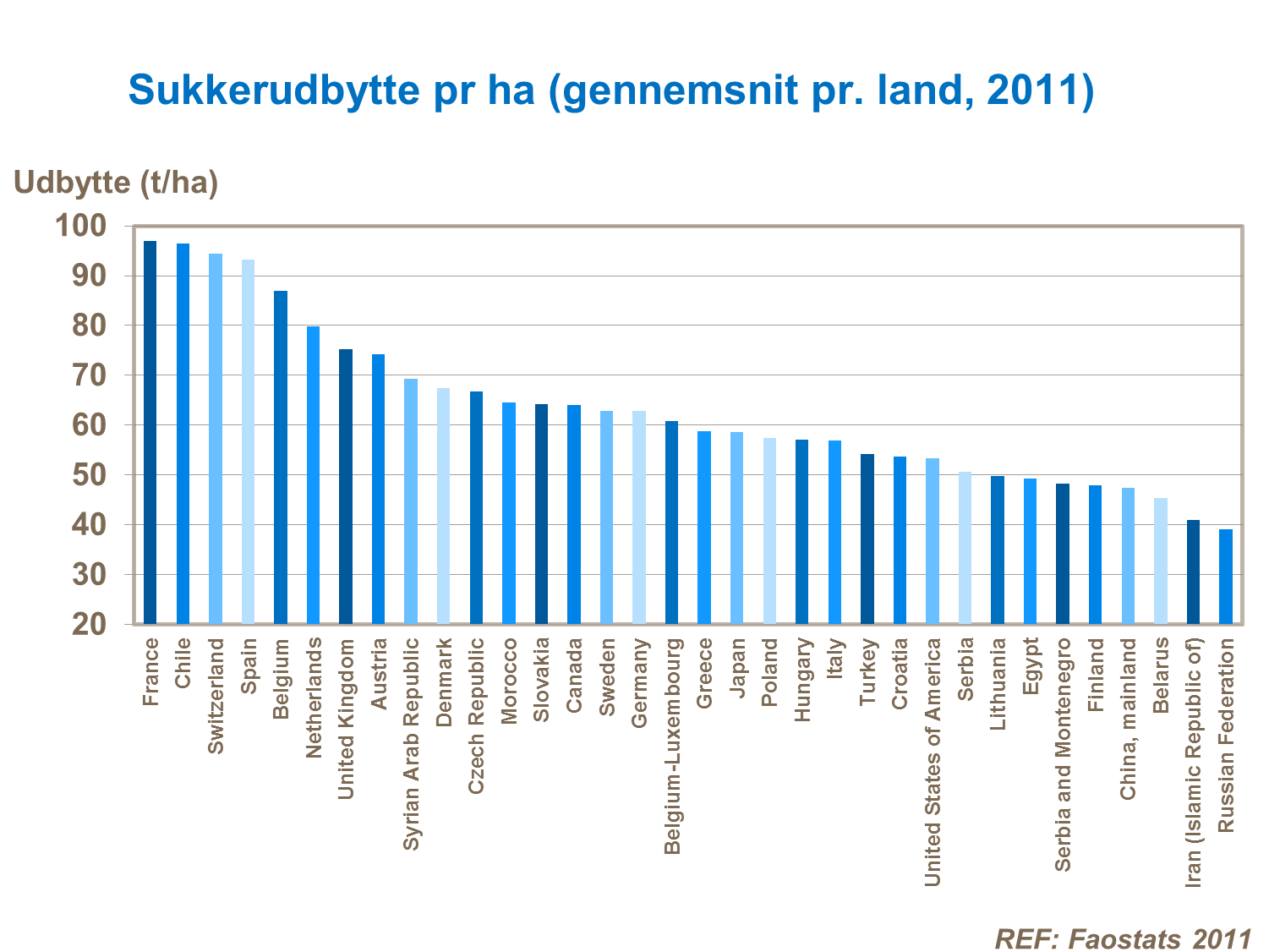 Med det samlede globale udbytte på 48 t/ha, bliver variationen mellem de forskellige lande lidt glemt. Denne er dog rigtig stor og går fra 6,5 til over 95t/ha.