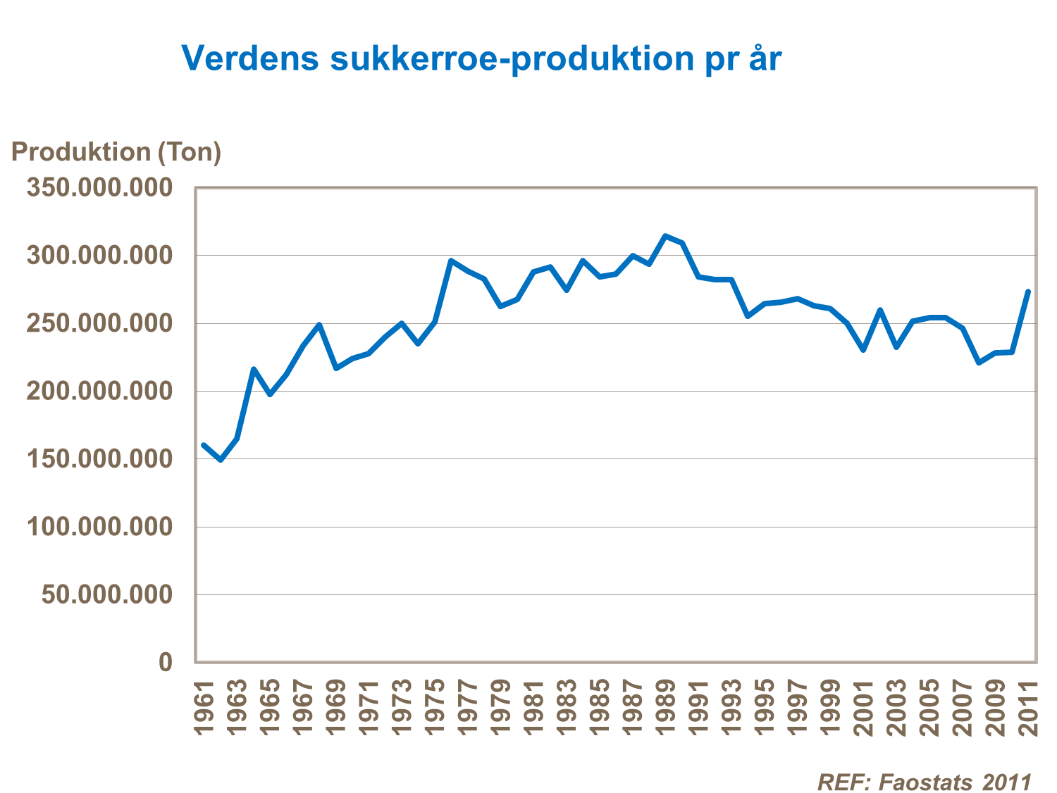 Det dyrkede areal med sukkerroer har vist en nedadgående trend over tid med arealet på 73% i forhold til 1961.
