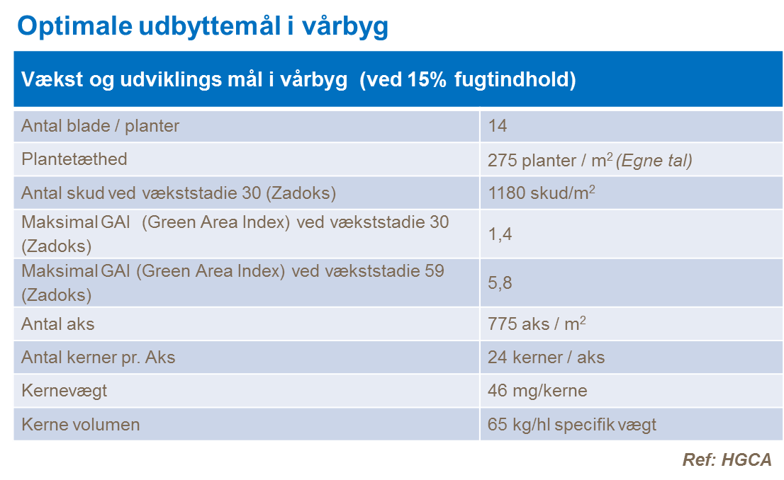 Herunder i tabellen ses hvordan udbyttet bliver påvirket af den tilgængelig mængde nedbør. Disse simple forhold er grundlaget hvorfra vi udvikler vores agronomiske principper inden for dyrkningen af vårbyg. For at kunne indsamle strålingen skal vi udvikle en tilpas stor bladmasse af sunde grønne blade til at indfange 90 % af den indkommende stråling. Bladmassen skal holdes grøn og sund til kernefyldningsfasen. Derfor er der to særlige mål: