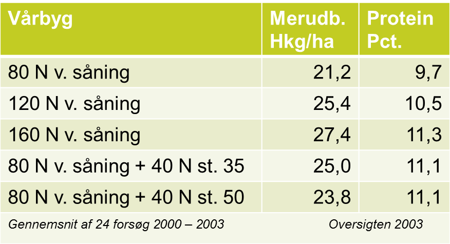 vårbyg, viste ikke en udbytteeffekt ved at foretage en deling af gødningen til vårbyg. I alt 24 forsøg udført fra 2000 – 2003.