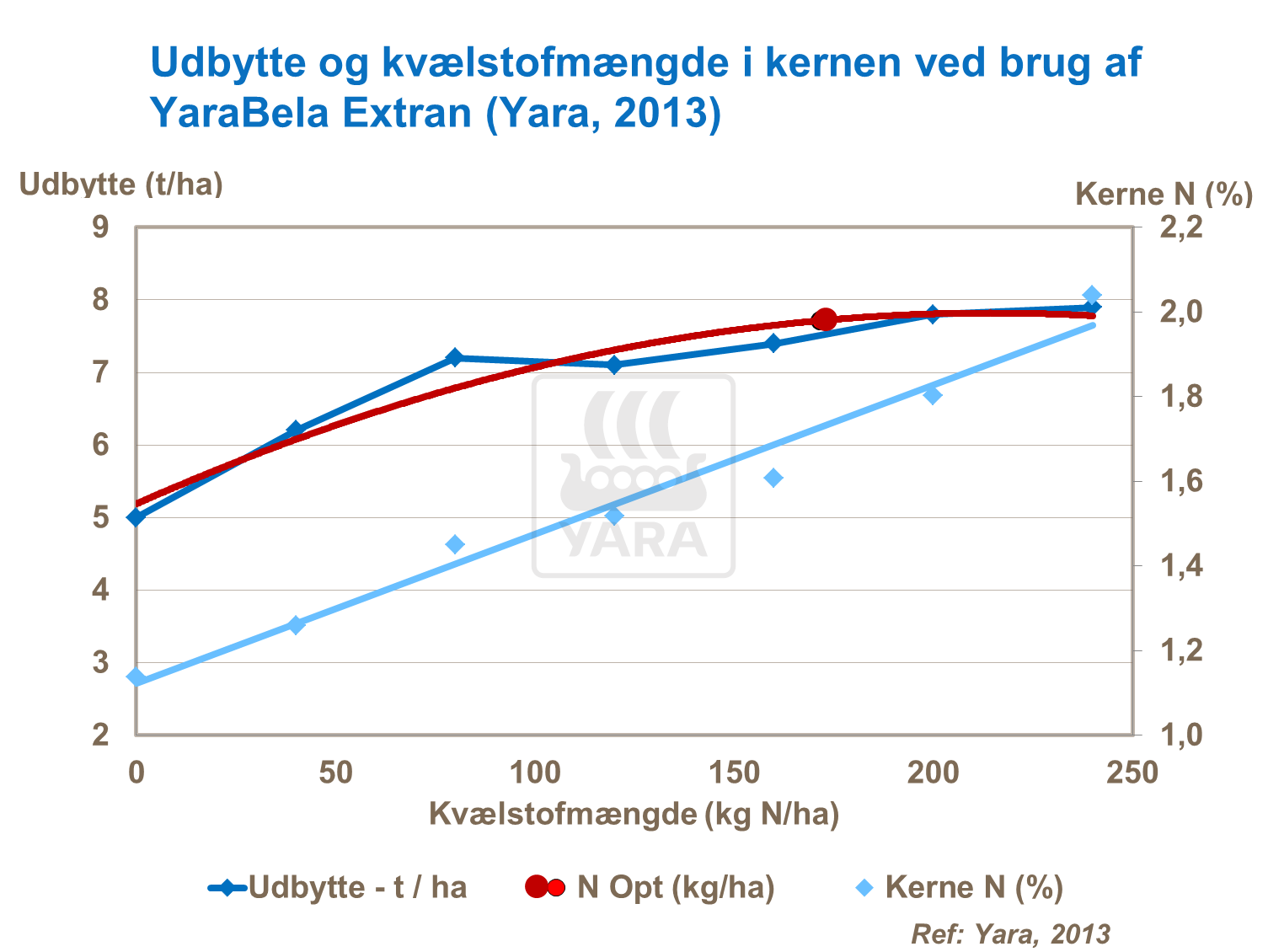 Kvælstofanvendelse har en stor effekt på proteinindholdet og proteinindholdet stiger ved øget kvælstoftildeling. Dette kan især være optimalt hvis kornet skal bruges til foder. Ved brug til maltning skal indholdet af protein dog være noget lavere. Det er derfor vigtigt at afstemme kvælstofanvendelsen i forhold til det formål som kornet skal benyttes til. Under kernefyldningen bliver kvælstof redistribueret fra stænglen, bladene og avnerne til de voksende kerner. Rodsystemet vil i denne fase forblive aktivt, hvilket giver mulighed for at optage store mængder kvælstof sent på sæsonen, som fører til høje proteinindhold.