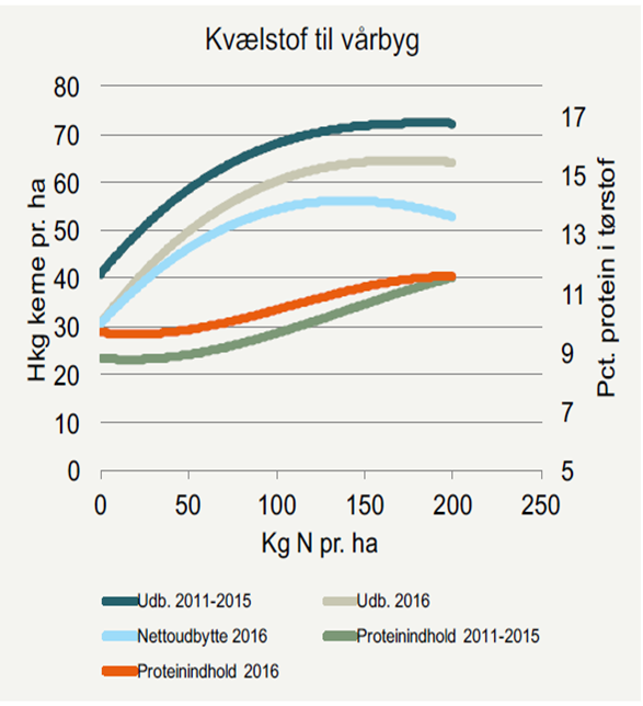 I 2016 var N-optimum på 142 kg N pr. ha (3,5 kr pr procent protein). Når der ikke afregnes for proteinindhold ligger proteinprocenten ved kvælstofoptimum i gennemsnit på omkring 10 procent, hvilket er indenfor kravet på et proteinindhold for maltbyg på 9,5 – 10,5.