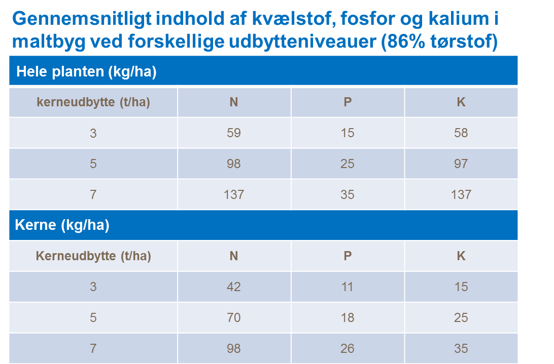 Kvælstof og kalium er de to næringsstoffer, der kræves i største mængder for at kunne fastholde høje vårbygudbytter. Behovet for fosfor er identisk med behovet for svovl. Hovedparten af behovet for de forskellige makronæringsstoffer forekommer under den hurtige forårsvækst.