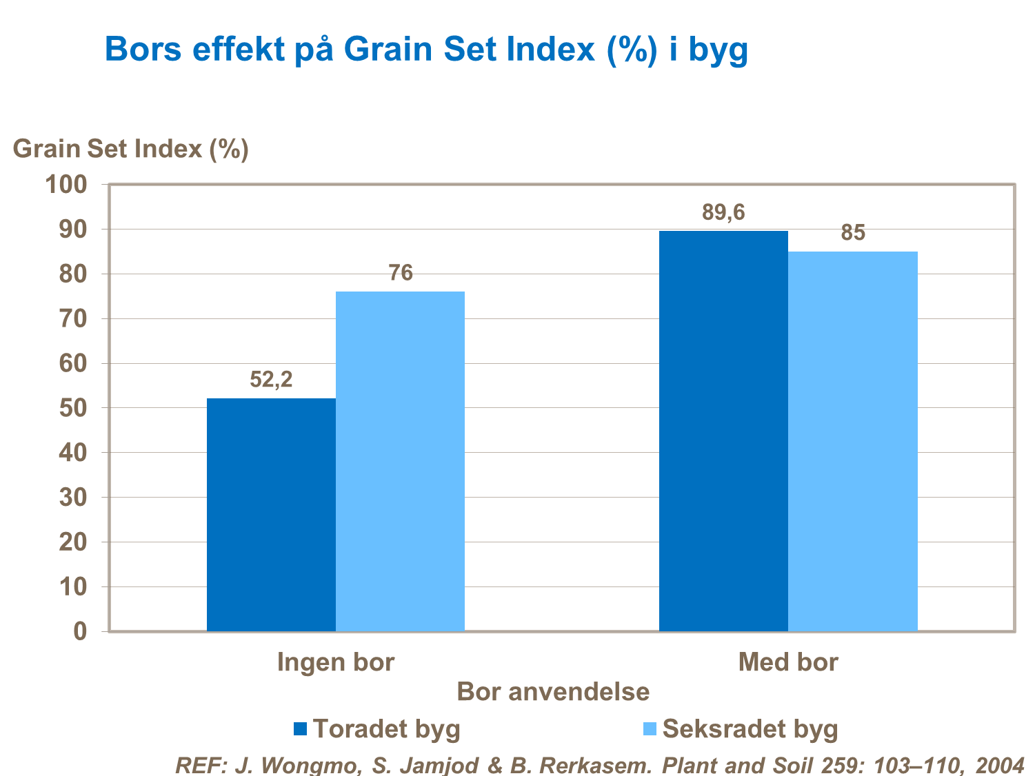 Bor har en veldokumenteret effekt på pollens overlevelsesevne og bormangel kan derfor føre til en reduktion i antallet af kerneanlæg per aks. En måleenhed som benyttes til at observere effekten af bor, er “Grain Set Index” som viser andelen af dannede kerner i forhold til antallet af blomster ved blomstring i procent. Et højt ”Grain Set Index” er målet, da dette vil føre til flere kerner per aks/ sideskud.
