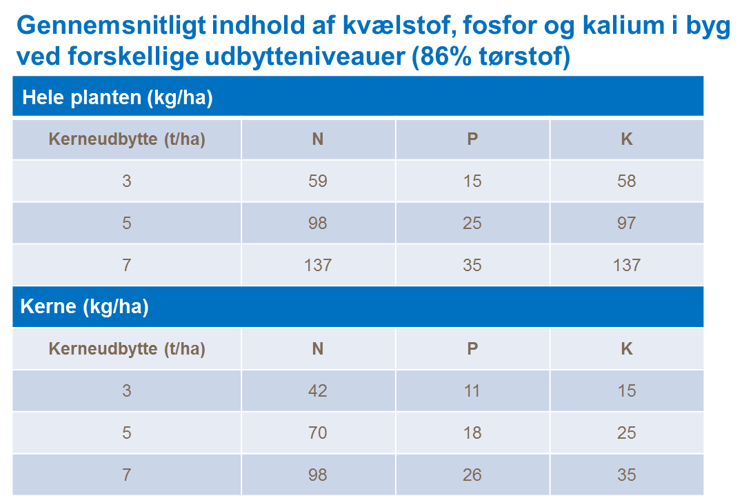 Høje udbytter kommer ved at opnå det korrekte antal blade og skud, fastholde en grøn bladmasse og forbedre antallet af kerner, aks, skud og kernestørrelse. En velbalanceret gødningsplan indeholder alle de makro- og mikronæringsstoffer, som er essentielle for planten og for at opnå de nævnte komponenter. I vinterbyg kommer 30-35 % af kernens kulhydrater fra fanebladet og stilken, 25-45 % fra akset og 20-45 % fra resten af planten.